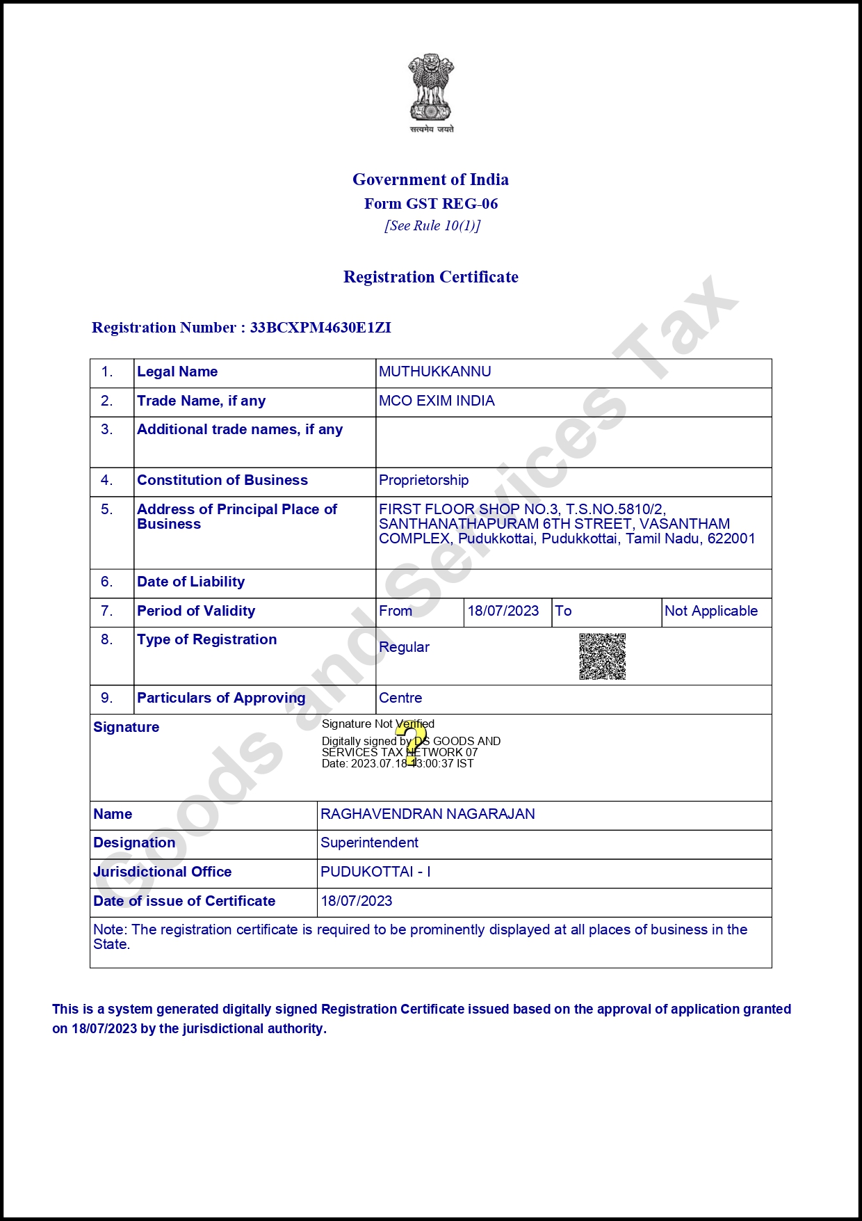 Registration certificate
